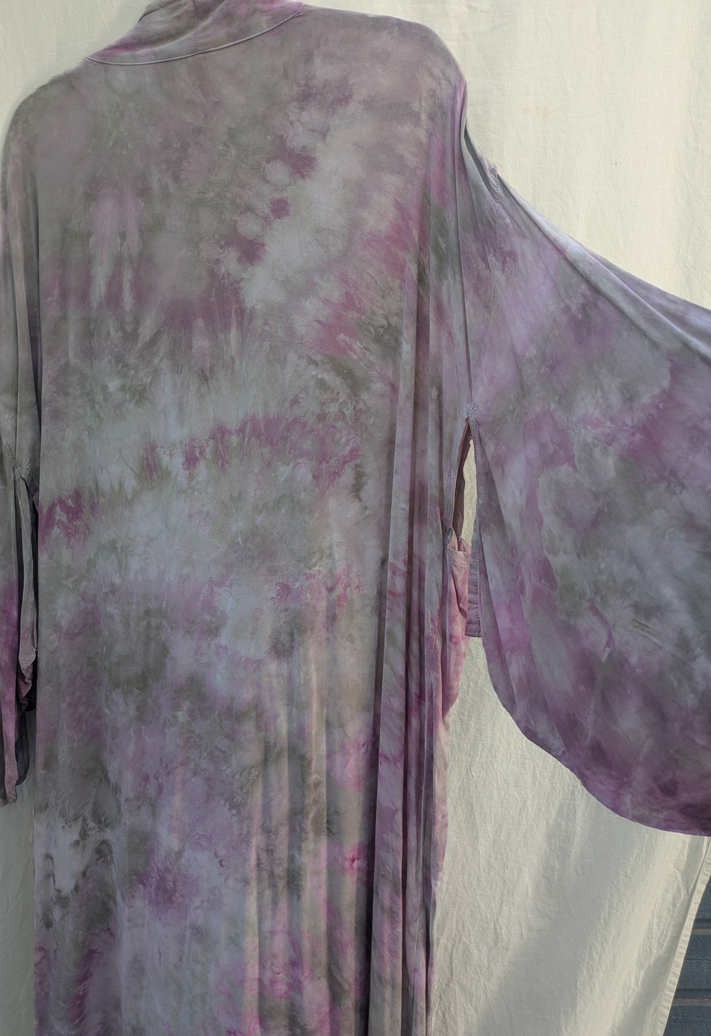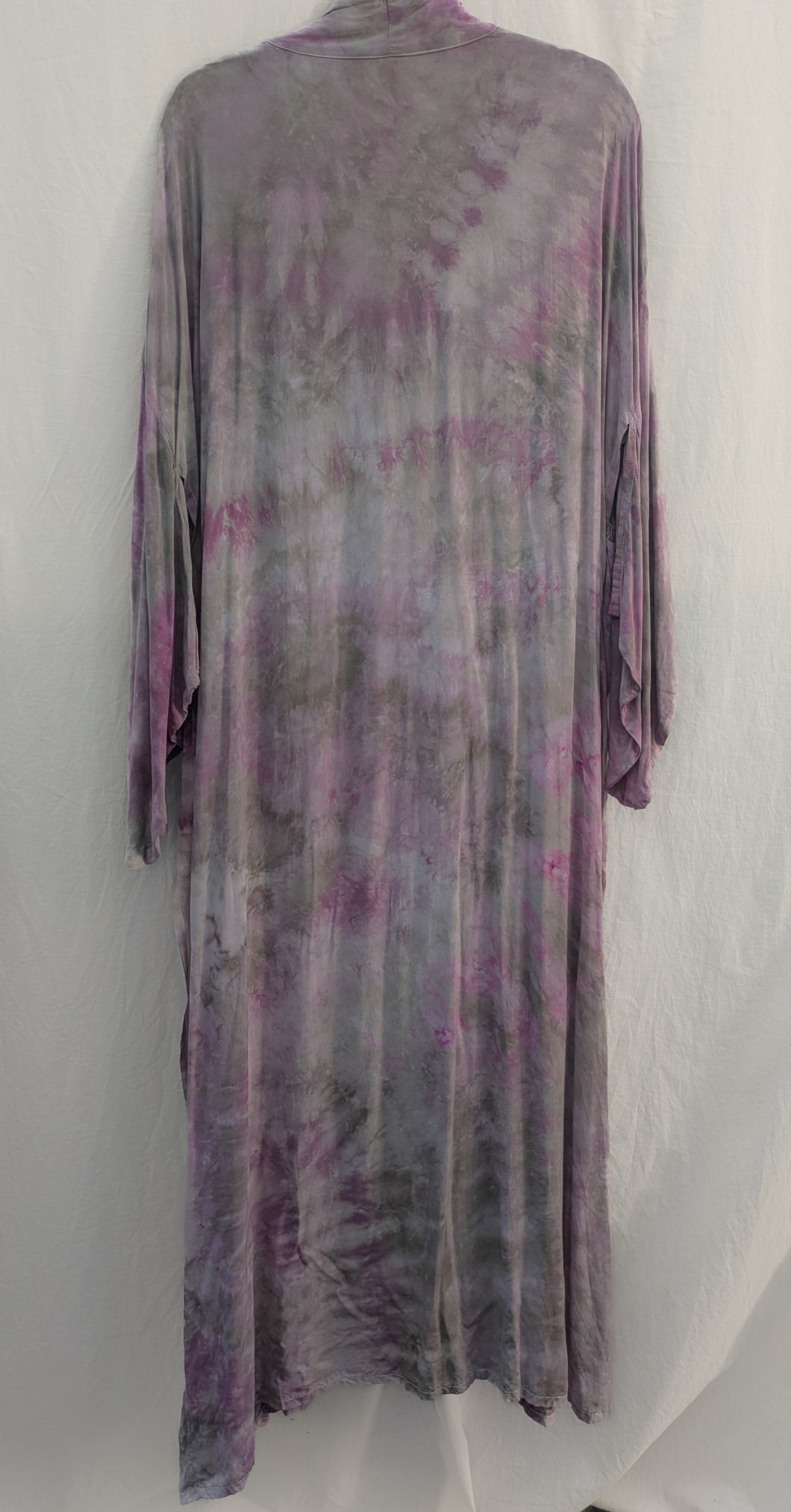 One of a kind, hand dyed, long Zeppelin style kimono. Comes with belt loops and removable tie belt. Two front pockets, side slits.